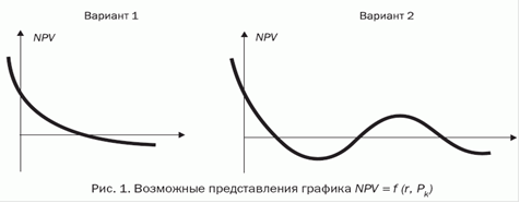 Если рассмотреть график функции NPV = f (r, Pk), то возможно различное его представление в зависимости от значений коэффициента дисконтирования и знаков денежных потоков ("плюс" или "минус"). Можно выделить две наиболее реальные типовые ситуации (см. рисунок 1).