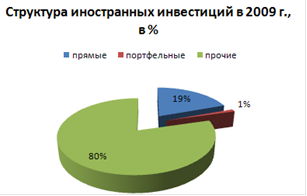 До 2007 г. наблюдалось стабильное увеличение притока иностранных инвестиций в российскую экономику. В 2008 г. в связи с кризисными явлениями в экономике и финансовой нестабильностью объем инвестиций снизился. Однако темпы снижения инвестиций в российскую экономику были не столь высоки, по сравнению с развитыми странами, что в первую очередь связано с тем, что в "посткризисный период наиболее привлекательными объектами инвестирования являются экономики развивающихся стран". В структуре поступления иностранных инвестиций в экономику России прямые инвестиции составляют 19%, портфельные - 1%.